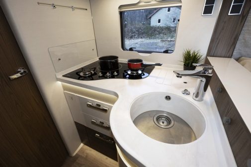 Ce matériau inaltérable (façon pierre naturelle) est à trouver dans les options. Son coloris clair crée un beau contraste avec la teinte foncée du réchaud (deux feux gaz et une plaque à induction)… également disponible en option. Les rangements de la cuisine sont en nombre (un long placard de pavillon compartimenté et cinq tiroirs profonds), ce qui permet de stocker tous vos ustensiles et votre vaisselle.