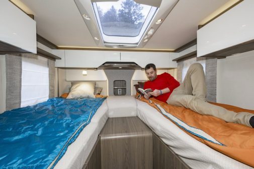 A l’arrière, des lits jumeaux au confort optimal. Leurs dimensions (89 x 203 cm) autorisent les plus grands à s’y allonger, les matelas en mousse froide multi-zone de 12 cm d’épaisseur assurant un bon maintien lombaire. Une rallonge centrale (en option) s’installe entre les deux couchages pour former un vaste lit de 171 x 213 cm.