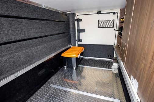 Ce volume est accessible de l’extérieur par deux grands portillons. Hymer revendique une capacité de chargement maximale de 350 kg, qui peut être augmentée de 100 kg grâce à l’option “prolongement du châssis”.