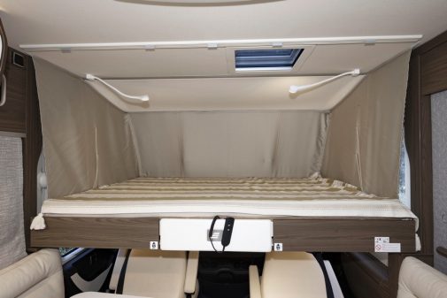 Pour parachever la thématique nuit, abordons le lit de cabine double (141 x 190 cm) logé au-dessus du poste de conduite. D’origine, il s’abaisse et se remonte manuellement. Mais un moteur électrique -encore une option (1 510 €)- peut réaliser cette manœuvre.