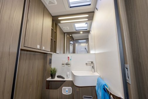 Dans un véhicule aussi haut de gamme que le B-ML I780, la salle d’eau se doit d’être de très belle facture. La douche occupe le flanc gauche du véhicule. Cette cabine est spacieuse et fermée par deux portes à battants. Le passage de roue est gommé par la présence d’un caillebotis qui recouvre le receveur et aplanit l’ensemble.