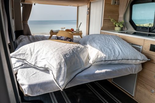 Concernant le mobilier, nous retrouvons l’aménagement typique d’un van à toit relevable, avec un meuble courant le long de la paroi gauche : cuisine derrière le conducteur, avec réfrigérateur à compression en façade de 49 l et vastes rangements à l’arrière, clos par des rideaux à lamelles rigides, au nombre de deux dans la version de 5,08 m et de trois dans la déclinaison longue. La table, elle, affiche des dimensions de 57 x 72 cm et adopte un système de fixation au plancher mettant à contribution les rails. Cela permet de la placer où bon vous semble. Notons ici une réserve d’eau propre de 90 l, capacité rarissime pour un van (55 l pour les eaux usées, un chauffe-eau est également disponible en option, à 1 890 €), ainsi qu’une centrale électrique de nouvelle génération, plug & play et facilitant les recherches de pannes et les interventions.