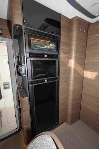 Cette crédence, on la retrouve également dans la cuisine, encadrant la baie à projection qui permet une bonne aération du lieu. Le bloc cuisine est vraiment très bien fait. Il intègre un grand évier profond et carré surmonté d’un robinet en bec de cygne escamotable, un réchaud à trois feux en ligne, un plan de travail, de vastes tiroirs et de grands placards de pavillon. Face au meuble principal de la cuisine, nous trouvons une colonne dans laquelle est encastré le réfrigérateur de 177 litres avec compartiment freezer ; le tout est surmonté par un four à gaz. Une lingère tout en hauteur jouxte cette colonne frigo + four.