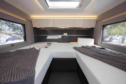 Dans la chambre du 780 SL, nous abordons des lits jumeaux assez haut perchés par rapport au plancher. Leur accès est toutefois simplifié par la présence de deux marches d’escalier. Les dimensions des lits sont parfaites (198 x 81 cm chacun) et leur confort est exemplaire : matelas à ressorts et excellent sommier à lattes. En tête des lits, trois grands placards de pavillon mis en valeur par un éclairage indirect offrent une importante capacité de rangement.