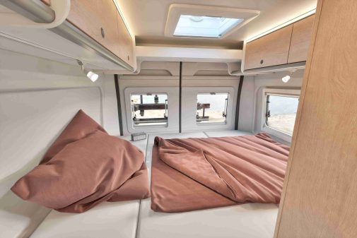 À bord, grâce à cette ouverture, la luminosité est au rendez-vous, en particulier dans le salon. Le mobilier clair, de bonne facture, et de nombreuses lumières directes et indirectes créent une belle ambiance. En partie arrière, le lit transversal surmonte une vaste soute. Ce modèle est aussi pourvu d’une salle d’eau Vario, système qui permet de transformer le local en cabine de douche ou en cabinet de toilette.