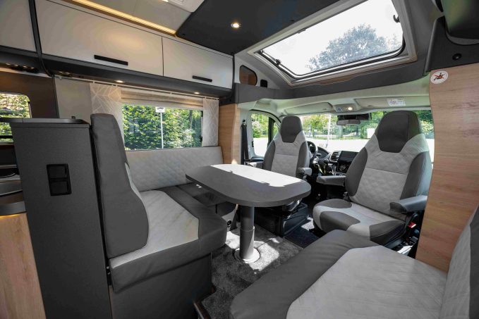 Le 700 MEG se distingue par son implantation très conviviale. Le salon, mis en valeur par une décoration des plus élégantes, peut aisément recevoir cinq à six convives. Si l’on atteint ce maximum de personnes, le plateau de la table sera sans doute un peu petit, sauf à poser de petites assiettes. En revanche, les convives apprécieront la lumière naturelle que le toit dôme laisse passer.