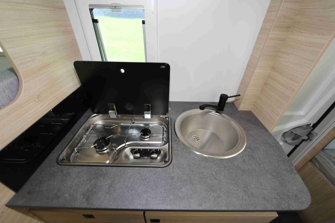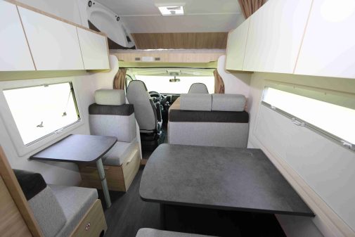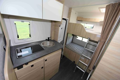 Les deux couchettes transversales arrière constituent un domaine idéal pour les enfants. En face, se trouve la salle d’eau, intégrant un lavabo/miroir escamotable. Le système est ingénieux. Dommage que la fermeture à scratch du pan rotatif ne soit pas des plus pratiques. L’espace cuisine est spacieux, mêlant un plan de travail, une plaque de cuisson et un évier. La dînette est un autre point fort du véhicule. Elle est composée de deux parties, positionnées face à face le long du couloir central. Idéale pour les familles nombreuses !
