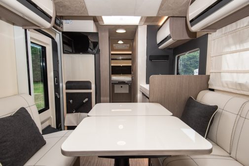 La liberté de mouvement dans le salon est ainsi à souligner. Alors que la hauteur du véhicule a été fixée à 2,85 mètres, soit dix centimètres de moins par rapport à un profilé classique, l'impression, une fois à l'intérieur, est tout autre, avec la sensation d'avoir affaire à un espace finalement beaucoup plus important quand on s'assied sur l'une des confortables banquettes du salon face-face. Leur couleur, oscillant entre le blanc et le chair, donne d'ailleurs une sensation de grandeur que la luminosité de l'habitacle vient encore plus renforcer, alors que les panneaux bois de couleur plus sombre viennent contraster l'ensemble. image