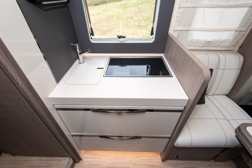 Le profilé compact C 699 LC fait en effet la part belle à la lumière. Comment ? Grâce à des ouvertures sur l'extérieur de qualité et surtout bien pensées. Un skyroof vient ainsi transformer le salon en une invitation au soleil à pénétrer l'intérieur, ce qui est parfait pour une petite pause lecture en fin de journée. La porte cellule dispose elle aussi d'une jolie ouverture sur sa verticalité. Alors qu'une baie latérale au-dessus du poste de cuisine et de ses deux feux complètent parfaitement la dotation.