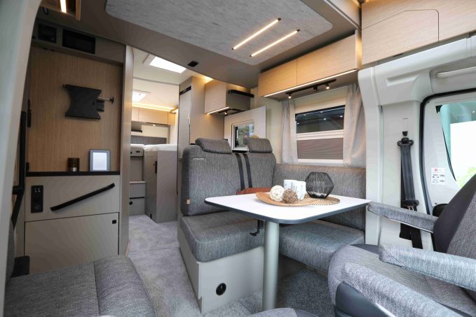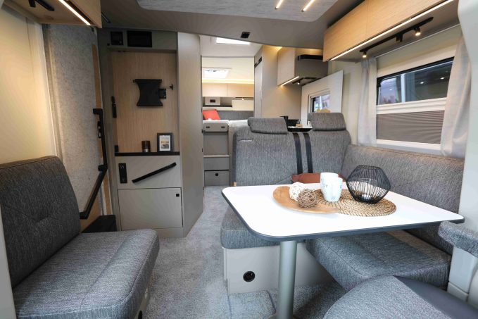La cuisine est classique avec un bloc principal en L et une colonne intégrant un grand réfrigérateur à absorption de 131 litres. Le bloc fait face à la salle d’eau deux en un. Une cloison pivotante permet en effet de transformer rapidement le local en grande douche ou en cabinet de toilette.