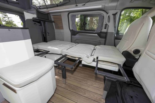 Un véritable tour de force qui simplifie la manœuvre au moment du coucher. En quelques dizaines de secondes, l’assise se transforme en un lit de 193 cm de long. Grâce aux supports intégrés dans l'épaisseur des assises et dossiers, il peut atteindre 124 cm de large et ainsi accueillir deux personnes. Le lit sous toit relevable lui affiche des dimensions de 130 par 208 cm.