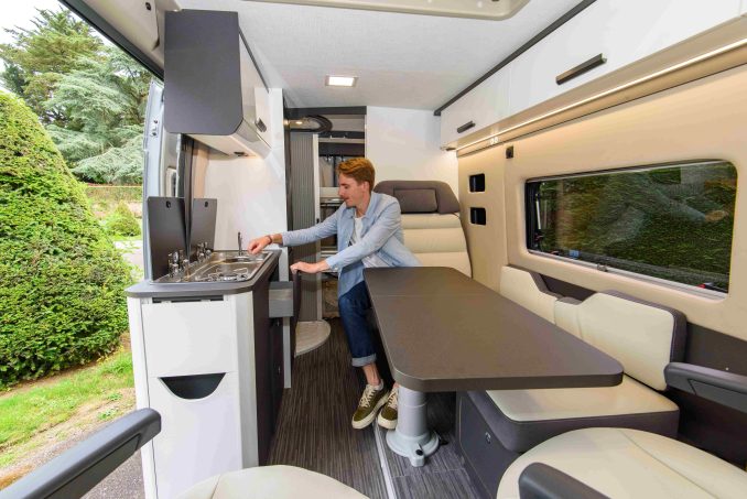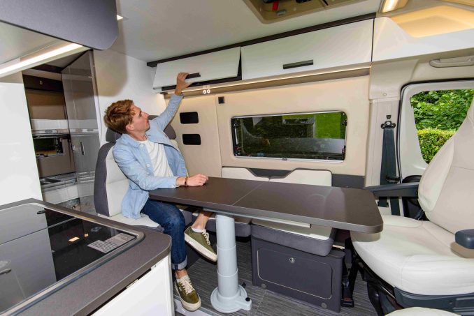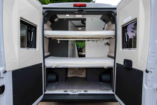 Cette nouveauté reprend tous les codes des fourgons “cargo”, dont le fameux grand lit double de pavillon arrière. En position la plus élevée, la hauteur de la soute atteint plus de 1,40 m. Quand le couchage est au plus bas, la zone de rangement reste similaire à un modèle avec matelas transversal classique.