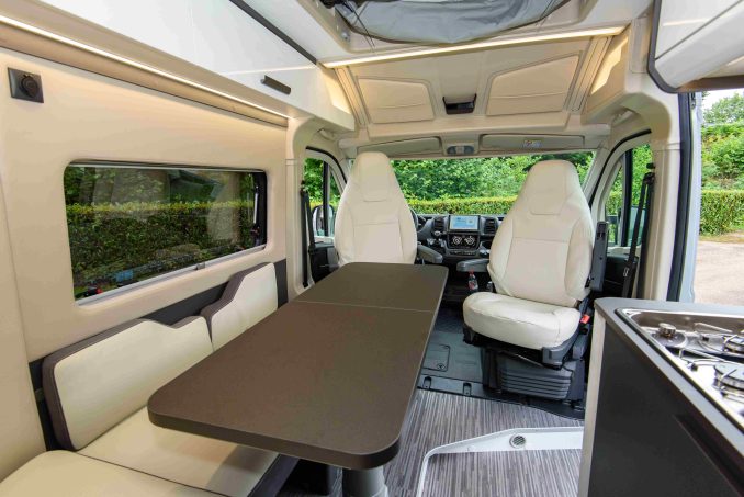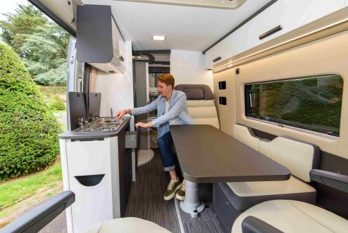 A l’avant, le Menfys 6 Maxi reçoit une banquette face route pour deux passagers. Dans cette version S-Line, on profite de la découpe de cabine qui augmente la sensation d’espace. Compte tenu du gabarit du fourgon et de son implantation, McLouis devait optimiser la salle d’eau. Celle-ci bénéficie d’un lavabo escamotable et les WC occupent une partie du volume de la douche. On apprécie la baie qui apporte de la clarté et de l’aération.