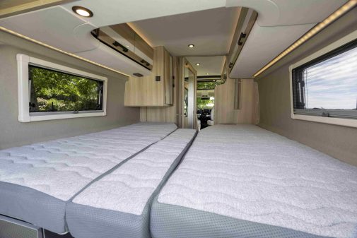 Au niveau de l’aménagement, nous retrouvons ce qui fait le succès du 746 depuis de nombreuses années. Ce fourgon de 6,36 m offre un plan maîtrisé, articulé autour d’une chambre où règnent deux grands lits jumeaux de 80 cm de large pour 193 et 195 de long. Les deux matelas sont joignables pour composer un grand couchage de 130 cm de large.