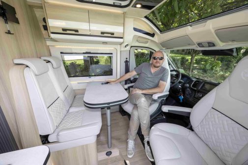 Campérêve a reconduit les différentes implantations de son catalogue. Mais il y a tout de même de la nouveauté avec l’apparition de la version Air du Magellan 746, une déclinaison équipée de série d’un toit relevable, signé Westfalia, abritant un couchage pour deux de 130 x 192 cm. Voilà qui permet à ce modèle d’offrir autant de place nuit que de places carte grise.