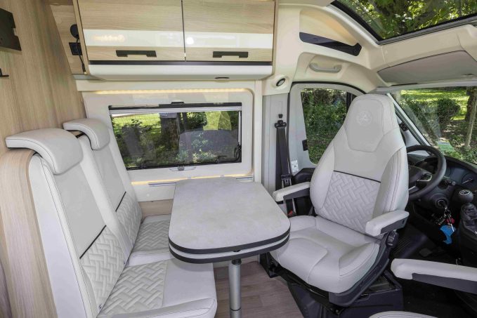 La dînette se montre des plus classiques avec sa banquette deux places face route et ses sièges de cabine pivotants. Disposée à l’entrée, la cuisine est prolongée par un grand réfrigérateur à compression de 146 l. La salle d’eau Duo’Space est modulable grâce à une paroi pivotante dévoilant, au choix, douche ou cabinet de toilette. Ce nouveau 746 Air, qui ravira les familles avec ses quatre couchages, est uniquement disponible en finition Saphir avec skyroof et présentation soignée.