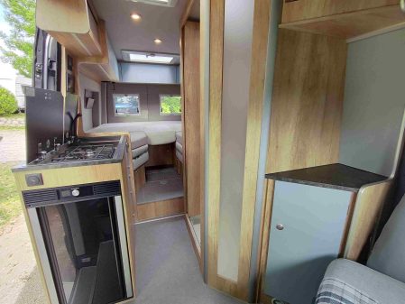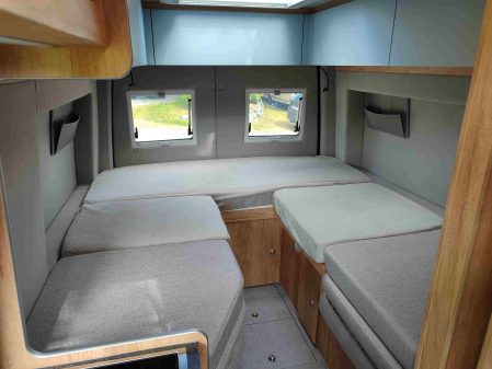 Par un jeu de matelas amovible, une partie de la chambre se transforme en une dînette face-face, agréable et confortable. Contrairement au Regent S de même gabarit, le Regent E mise sur un frigo à compression logé en bout du bloc-cuisine pour un double accès, intérieur ou extérieur.