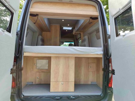La salle d’eau (empruntée au Regent EB) est logiquement positionnée sur l’avant du véhicule. On retrouve un lavabo rétractable ainsi qu’un WC et une douche isolable par des portes à battants et un rideau Nylon. Ce choix permet de disposer en partie arrière de lits jumeaux de 2 mètres pour l’un et 1,85 m pour l’autre avec une largeur commune de 80 cm. Les couchages profitent de sommier à assiettes Fröli et peuvent, si besoin, être réunis. A noter que la tête de lit est commune et peut se relever pour libérer l’espace en soute pour y entreposer, pourquoi pas, un vélo. Le plus intéressant se trouve au pied de lit.