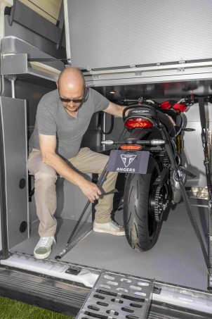 La soute, d’ailleurs, réserve elle aussi quelques surprises bien pratiques pour une utilisation sport. Il est ainsi possible de s’y tenir debout grâce à la tête de lit, côté gauche, qui se relève à quasiment 90°. Un strapontin permet même de s’asseoir pour enfiler ses bottes de moto ou ses chaussures de vélo. Cet espace est séparé de la partie jour par une petite cloison amovible et dotée d’un portillon. Enfin, le volume est doté de rails d’arrimage et d’œillets coulissants qui permettent de sangler le chargement.