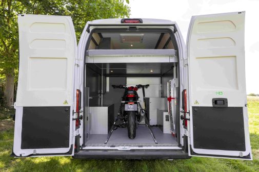 Enfin, la version haut de gamme Addict (70 600 €) ajoute une présentation spécifique, des batteries AGM (au lieu d’électrolyte), un système multimédia, une caméra de recul, un skyroof, une douchette extérieure et une robuste tôle “grain de riz” qui protège le plancher de la soute, des griffures de la béquille d’une moto.