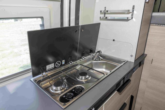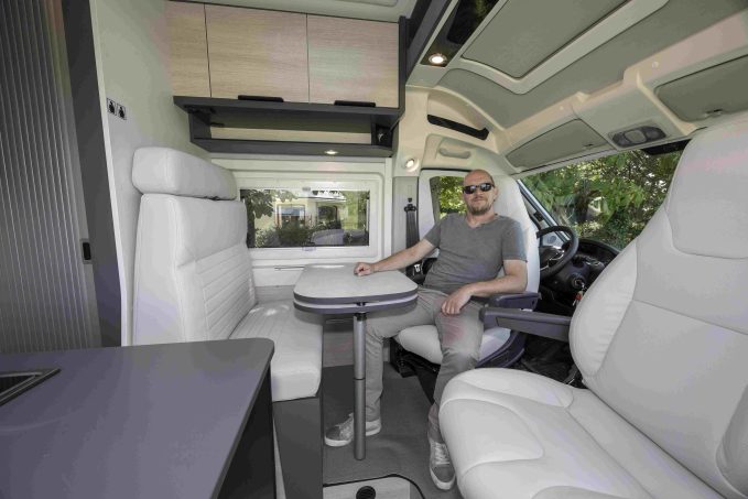 Pour le reste, le Camper Sport se montre classique : dînette pour quatre avec banquette face route, sièges de cabine sur embase pivotante et table, cuisine deux feux et réfrigérateur de 84 l à l’entrée et salle d’eau en vis-à-vis.