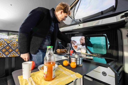 Nous sommes agréablement surpris par la quantité de lumière à l’intérieur de l’habitacle. Des points d’éclairage, directs ou indirects, il y en a presque trop ! On retrouve des LED sous forme de bandeaux ou de spots dans le toit relevable, sous le lit du toit, au-dessus du bloc cuisine et en dessous. Deux veilleuses sont installées en hauteur à l’arrière, permettant de feuilleter un livre une fois couché. Enfin, de petites lampes tamisées s’occupent du couchage bas. C’est donc baigné de luminosité que nous nous mettons en cuisine.