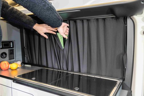 Pour plus de discrétion, nous fermons les rideaux, désormais aimantés pour faciliter leur fermeture. Des prises USB sont disposées aux quatre coins de l’habitacle, idéal pour recharger smartphone et autres petits appareils électriques. Dans le flanc droit de l’habitacle, une encoche fait même office de « table de nuit » pour ranger son portable et quelques magazines.