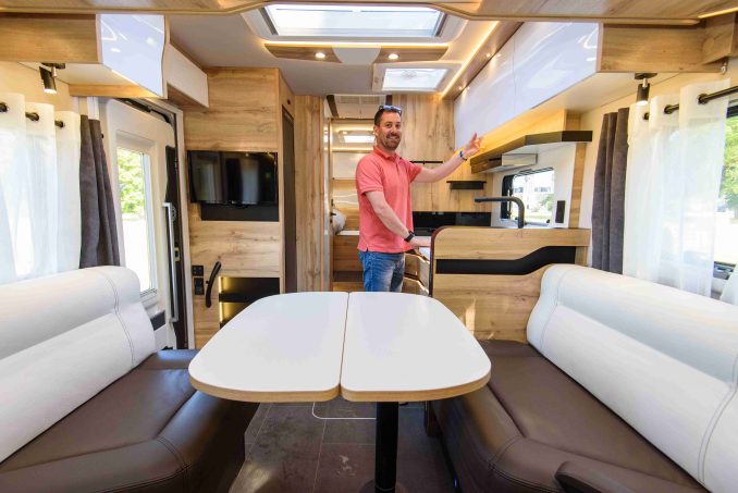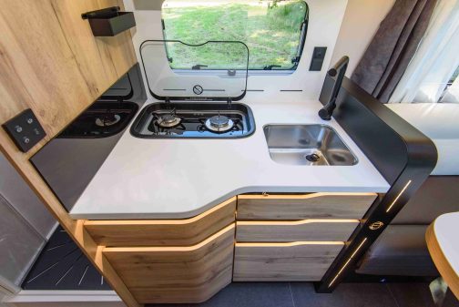 A l’avant, Le Voyageur a dû faire des compromis notamment sur la taille du salon. Rassurez-vous, le confort est réel et l’utilisation par quatre personnes possible. Le coin repas se compose de deux banquettes en vis-à-vis et des sièges pivotants du Mercedes. L’ensemble est surmonté d’un lit de cabine de 140 x 190 cm. Sur le modèle de l’essai, le mécanisme électrique et la possibilité de rallonger la surface du lit sont en option. La cuisine a également été réduite, mais conserve un beau volume de rangement ainsi qu’un joli plan de travail devant le réchaud deux feux.