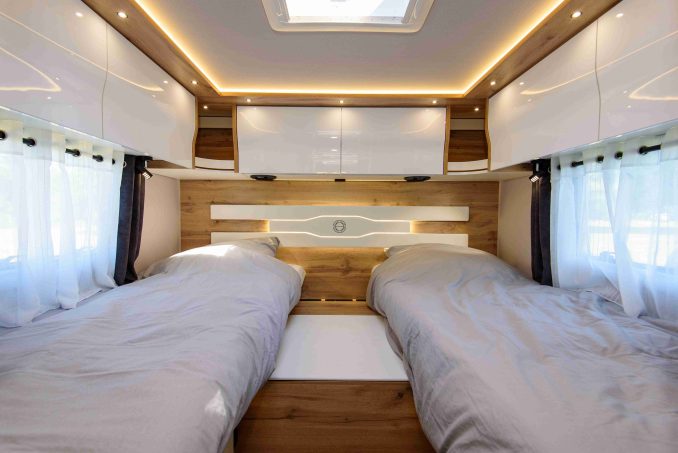Le constructeur n’est pas parti d’une feuille blanche. D’ailleurs, pourquoi mettrait-il de côté des postes maîtrisés et appréciés ? C’est ainsi que cette nouveauté reprend à l’identique la chambre de son grand frère, le 7.9 GJF. On dispose donc de lits jumeaux de 80 x 200 cm sur soute garage d’une hauteur constante de 1,10 m, voire 1,20 m en optant pour les “lits hauts”. Cet espace nuit s’accompagne d’une salle d’eau en deux parties, disposant chacune d’un espace ample et appréciable. La douche est un modèle du genre avec un plancher totalement plat. Les deux éléments peuvent être réunis en transversal pour offrir plus d’aisance à l’usage.