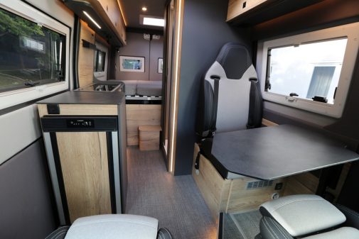 En effet, à bord, la raison reste de mise avec un plan largement rebattu : lit transversal, cuisine et salle d’eau en partie centrale, dînette à l’avant ! L’ensemble ne dépayse pas. Reste que certains aspects apportent à l’intérieur une certaine exclusivité. C’est notamment le cas avec le siège indépendant arrière présent dans la version trois places du véhicule. Une déclinaison avec une large banquette existe, mais cette assise ne comportant qu’une seule ceinture, l’homologation ne peut se faire en 4 places carte grise (version proposée à 107 899 €). Une singularité déjà vue sur les Summit Shine. Pour passer le modèle en quatre places, il faut aller puiser dans le catalogue des options, un siège sous forme d’une armature peu pratique à manipuler, difficile à installer et lourde. Attention, alors, à la charge utile…