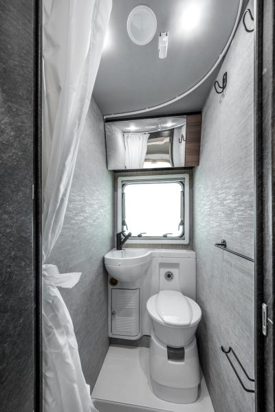 Au bout du couloir séparant les deux rangées de couchage, une salle d’eau a été aménagée transversalement contre le panneau arrière de la cellule. Elle est assez étriquée, mais fonctionnelle. On trouve alors dans un même espace, le receveur de douche (cabine isolée par un rideau Nylon), les WC à tête pivotante et le lavabo. Ici aussi, une baie laisse passer la lumière et assure la ventilation nécessaire du local.
