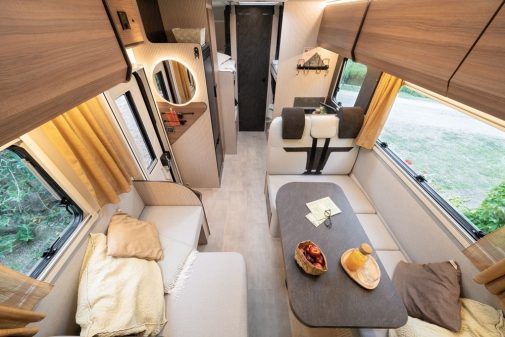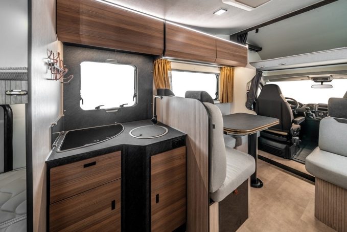La capucine Sarus 50 repose sur le châssis Fiat Ducato de 140 ch. Elle est commercialisée au prix de 62 102 €. Pour conserver ce tarif raisonnable, Rimor a fait l’impasse sur un bon nombre d’équipements d’origine. Mais peu importe, car il reste l’essentiel : un habitacle bénéficiant d’une ambiance moderne, chaleureuse et flatteuse, générée par des panneaux de parois décoratifs et un joli stratifié haute résistance, employé pour la table et le plan de travail. Vraiment, la qualité perçue de cette capucine Sarus est convaincante. Au point qu’on en oublierait presque son positionnement d’entrée de gamme !
