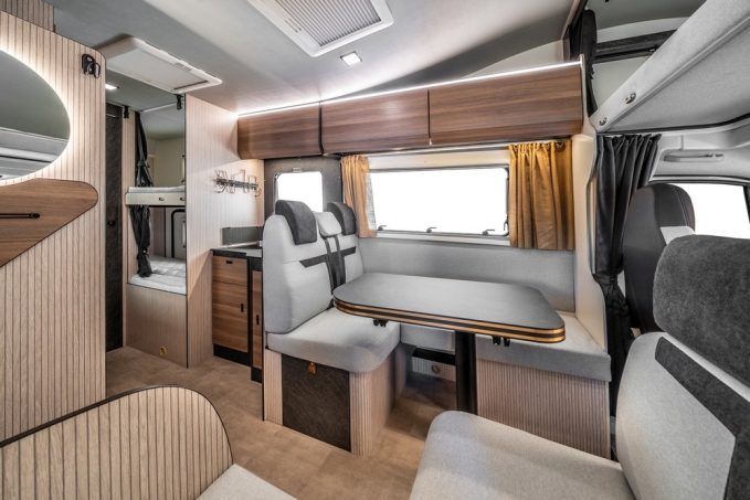 Pour la partie jour, malgré le gabarit restreint du véhicule, le constructeur Rimor s’est surpassé en réussissant à installer un confortable salon six places, constitué d’une double dînette en “îlot”. Autour du vaste plateau de table décentré, dont la surface peut être doublé en le dépliant, logent deux banquettes en L en vis-à-vis, celle de droite ayant un retour inversé par rapport à l’autre. Sur ce même côté, les deux passagers voyagent dos à la route alors que sur le côté gauche, on est installé dans le sens de la marche. Avec les deux sièges du porteur, cette capucine est donc bel et bien homologuée en six place carte grise.