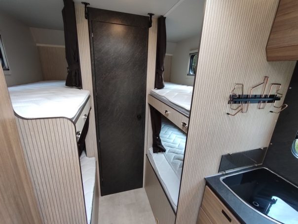 Sarus est une gamme qui a intégré le catalogue Rimor pour cette saison 2025. Elle est composée de huit profilés et six capucines. Dans le cadre de cet essai, nous nous arrêterons sur ces dernières, en particulier le modèle 50, une implantation déjà exploitée par le constructeur italien, mais loin d’être courante. En effet, il autorise six personnes à dormir dans ce camping-car – dont la longueur est par ailleurs inférieure à 7 m de long – sans la moindre opération à réaliser autre qu’enfiler son pyjama. Elle revêt un caractère fonctionnel, surtout dans le cadre d’un usage familial. Difficile à croire n’est-ce pas ? Et pourtant, il suffit d’observer nos photos montrant les différents postes pour en être convaincu. Regardez en premier lieu l’image de la chambre. On y aperçoit deux paires de couchettes superposées, installées de part et d’autre d’un couloir central.