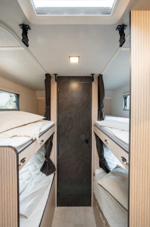 La Sarus 50 offre quatre véritables lits simples longitudinaux de 71 x 190 cm chacun. Une chambrée dans un camping-car qui fera le bonheur des enfants. Ces lits, dont les matelas sont assez denses, peuvent également servir à des adultes, pour une virée entre copains. Chaque couchette dispose d’un rideau d’intimité et d’une baie qui apporte de la clarté en journée et qui, entrebâillée ou ouverte, permet à l’air de circuler. Les couchages du bas reposent chacun sur une soute bagage, qui se transforme en garage en basculant les sommiers. Dans la capucine, se trouve un lit double de 140 x 220 cm qui constituera la sphère parentale.