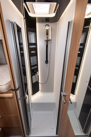 Poursuivons notre visite. Dans la cuisine, le bloc principal est relativement imposant. Cela permet de profiter d’un grand évier, d’un réchaud 2 feux affleurant avec couvercle en verre et d’un assez grand plan de travail dont le revêtement est identique à celui de la table. La hotte aspirante est installée de série. En face, une colonne intègre le grand réfrigérateur à absorption (167 l avec un compartiment congélation indépendant de 29 l). Pour ranger casseroles, verres, assiettes, couverts, boîtes de conserve et autres paquets de pâtes…, on peut compter sur les deux placards de pavillon et six tiroirs vastes et profonds. Pour limiter les risques d’ouverture au roulage, un verrouillage centralisé bloque toute la série de tiroirs.