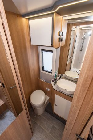 Concernant l’implantation, le Toscan 74GC abrite des lits jumeaux de 80 cm sur 191 chacun. Dans la dotation d’origine, nous trouvons deux rallonges de matelas qui, une fois positionnées, permettent de créer un couchage king size (218 x 194 cm). L’accueil nocturne ne s’arrête pas là. Le profilé est en effet équipé de série d’un lit de pavillon qui s’actionne grâce à un mécanisme électrique. Il s’abaisse donc facilement jusqu’au dossier de la banquette juste en appuyant sur l’interrupteur. On profite ici d’un matelas de 116 x 190 cm avec un tirant d’air de 60 cm.
