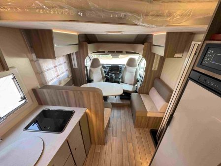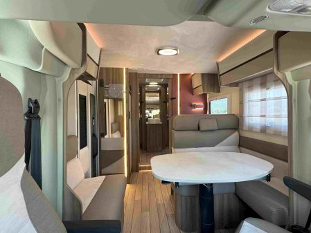 On ne peut donc que se réjouir qu’il soit de nouveau exploité par Roller Team pour ce profilé 266 TL. Certes, ce modèle présenté ici sur Ford (il est aussi disponible sur Fiat Ducato pour 4000 € de plus) est imposant, avec ses 7,45 m. Mais intérieurement, il est magnifique ! Les occupants disposent d’un vaste salon formé de banquettes latérales en vis-à-vis et des sièges de cabine montés sur embase pivotante.