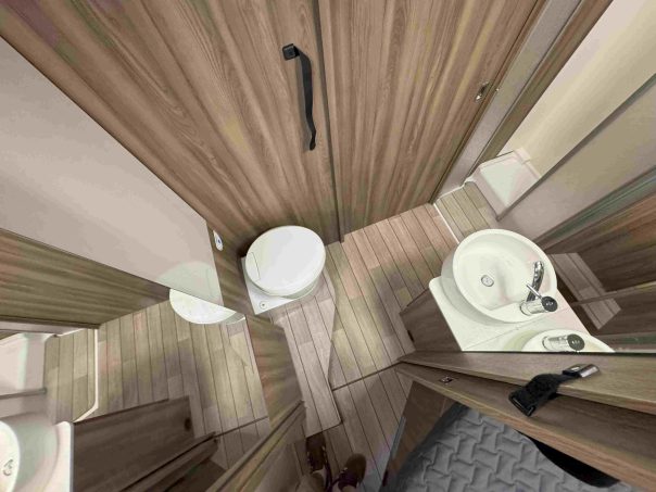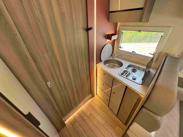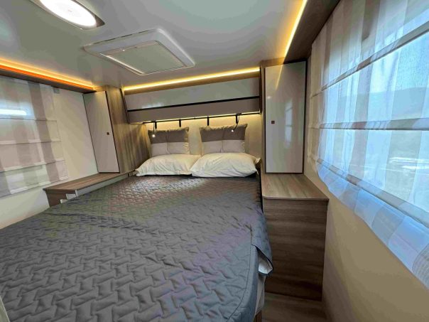 Plus vers l’arrière se trouve la cuisine avec bloc principal sur la gauche et réfrigérateur à droite. En poursuivant en direction de la chambre, nous passons pa la salle d’eau transversale qui constitue un vrai sas de séparation entre les parties jour et nuit. Enfin le lit central, de grandes dimensions, surmonte une vaste soute garage au volume modulable. En résumé, tout est réuni pour que le Kronos 266 TL séduise un maximum de clients.
