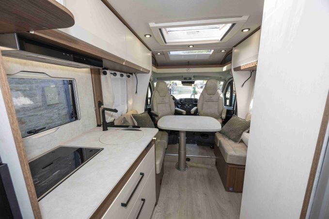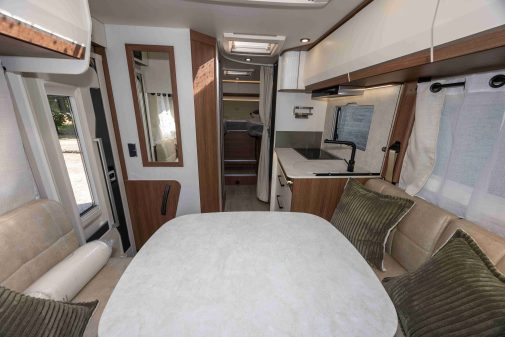 En faisant abstraction de ce doux parfum, le 69 LJG qui vient en remplacement du 65 LJG s’en distingue de plusieurs manières. Premièrement, il est plus long de 40 cm. Cela semble peu, mais ce prolongement est nettement suffisant pour installer des banquettes latérales en vis-à-vis à la place d’une banquette en L. Ce qui change considérablement la configuration du salon.