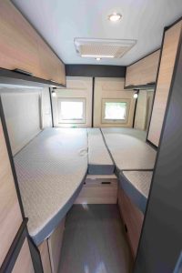 Nous retrouvons donc ce grand fourgon (6,36 m) qui avait tiré sa révérence il y a quatre ans maintenant. En chambre, donc, deux grands lits séparés qui peuvent ne former qu’un seul couchage grâce à un support et un complément de matelas. L’ensemble peut bien évidemment se relever pour offrir un volume de chargement en soute conséquent, mais qui restera limité pas les rangements inférieurs. Une grande penderie complète la pièce.