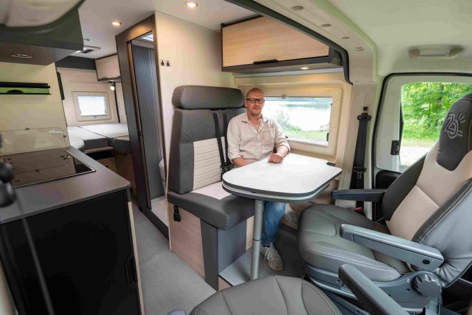 Plus en avant nous trouvons une disposition classique des espaces et postes avec une dînette constituée d’une banquette deux places face route et de sièges de cabine pivotant, une salle d’eau trois-en-un et un meuble de cuisine (réchaud deux feux, réfrigérateur de 84 l en bout) à l’aplomb de la porte coulissante. Ce dernier est prolongé par un meuble de rangement haut en deux parties. Ici présenté en édition spéciale 20 ans, ce D68 profite de la sellerie exclusive Célébration, du store extérieur ainsi que de la boîte de vitesses auto 9 à rapports associé à la motorisation de 140 ch.