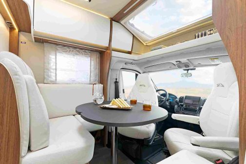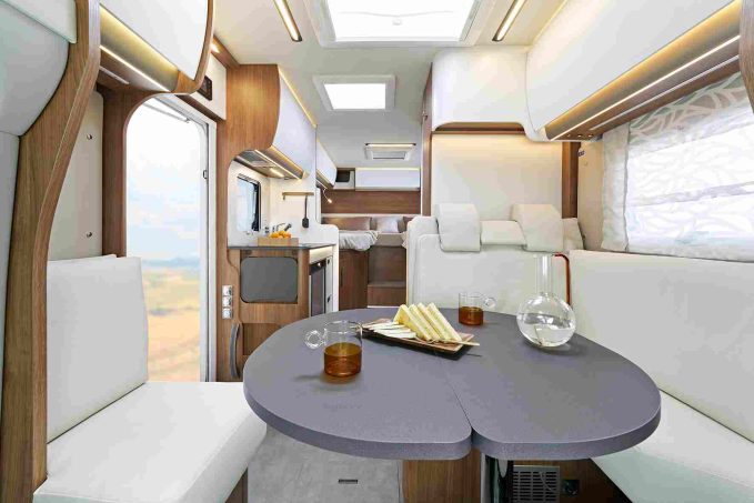 Ce profilé se reconnait par ses sérigraphies extérieures au style épuré et dynamique. Le deuxième point qui fait du Titanio un camping-car exclusif est son intérieur très clair. L’ambiance « Noce Opera » est superbement mis en valeur, de jour, par les entrées de lumières qui se font par le sky roof de série et, de nuit, par les éclairages LED aussi efficaces qu’ils sont économes en