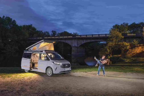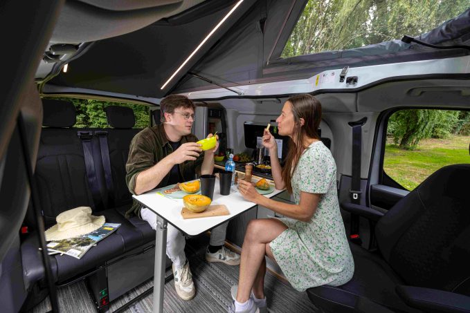 Arrivés à l’étape, le couple déploie son camp. Charlotte ouvre l’auvent Thule (une option à 1 100 €), un must pour créer un espace extérieur. À bord, Xavier manipule sans peine le toit relevable. Une fois ce dernier ouvert, on tient debout à l’intérieur et on aère avec un zip sur la tente de toit ou grâce à deux fenêtres latérales équipées de moustiquaires. Seul bémol : les vitres teintées, si elles protègent la cellule des regards indiscrets, assombrissent trop l’espace, nécessitant d’allumer les LED même en plein jour. Pour 2026, la marque a choisi des fenêtres moins opaques.