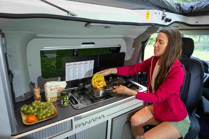 Affamés par le trajet, le couple se prépare un en-cas. La cuisine regroupe un réchaud deux feux, un évier, un réfrigérateur de 42 L avec freezer et un plan de travail confortable. La table, rangée sous la banquette à l’arrière, coulisse sur le rail du bloc cuisine et s’utilise aussi bien à l’intérieur qu’à l’extérieur, un vrai plus. En revanche, les placards à lamelles sont capricieux et les aimants de fermeture peu efficaces. Le tiroir à couverts, lui, oblige à ouvrir la porte latérale pour y accéder, ce qui complique son usage. Outre ce désagrément, le bloc cuisine est bien pensé et assez spacieux pour un van compact. Notons que ce P10+ dispose de 50 l d’eaux propres et 32 l d’eaux usées.