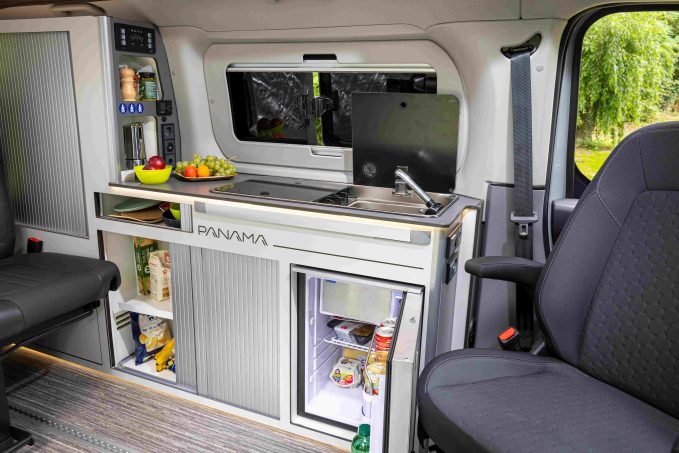 C’est sur ce dernier que Charlotte et Xavier, la trentaine et un quotidien bien chargé, ont jeté leur dévolu pour sa facilité d’accès tant pratique que financière, idéale pour des primoaccédants comme eux. Basé sur le Ford Custom 2025, spacieux et riche en aides à la conduite, leur van affiche des lignes sobres et dynamiques, presque sportives, qui lui permettraient presque de se prendre plus pour un monospace que pour un utilitaire. Les vitres arrière surteintées, soulignant la carrosserie du pare-brise jusqu’au hayon, accentuent ce style très automobile encore réhaussé par le gris profond Moon Dust Silver qui l’habille. Avec ses 5,05 m de long pour 2,15 m de large, il se faufile aisément dans les centres urbains et les chemins étroits. En revanche, avec 2,06 m de haut il faut être méfiant avec les barres de hauteur car s’il passe sous la majorité d’entre elles, certaines communes ayant tendance à abaisser le seuil à 1,90 voire 1,80 m de haut, attention aux rayures ou pire ! Pour 2026, Panama laisse le choix entre deux couvre-chefs. Le SCA qui équipe le P10+ de notre couple et porte la hauteur au-delà des 2 mètres, mais présente l’intérêt d’être largement ouvrable, où un modèle exclusif à la marque et permettant de rester sous la barre fatidique, mais seulement équipé de trois petites fenêtres (à l’avant et latérales).