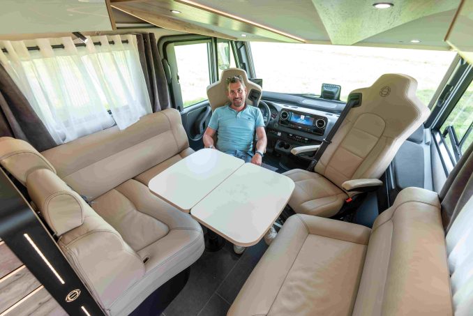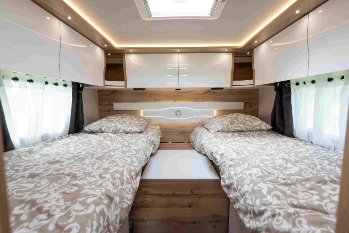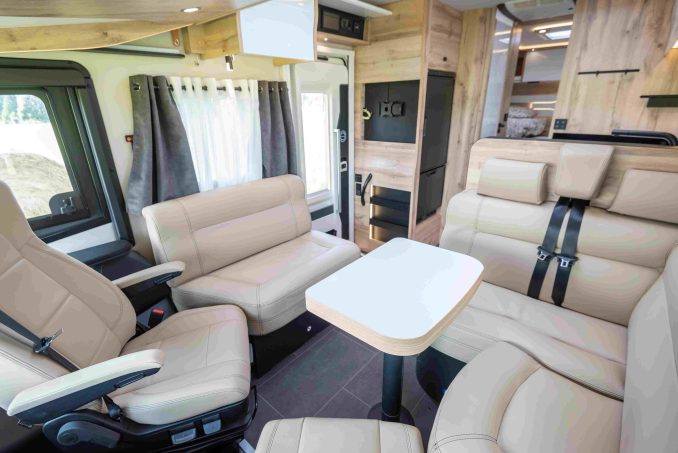Son salon, imposant, aux banquettes couleur crème, donne directement envie de s’y asseoir, en plus de constituer la principale innovation du véhicule, en prenant désormais une forme en L. Le bloc cuisine, juste derrière, se démarque par ses nombreux rangements et son poste de travail, qui allie un aspect fonctionnel à une qualité perçue indéniable. L’espace intérieur permet de circuler librement et facilement jusqu’à la chambre, en longeant une spacieuse cabine de douche.