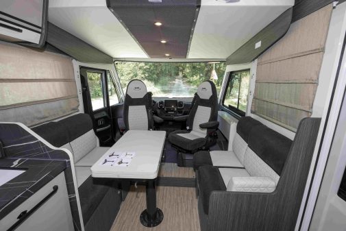 Si l’implantation du Nevis 881 n’est pas nouvelle, l’évolution globale du modèle est spectaculaire. À l’extérieur, la face avant a été totalement redessinée. Un nouveau moule a été créé permettant l’intégration d’un pare-brise panoramique, lequel offre 50 cm de visibilité supplémentaire par rapport à l’ancienne version. La teinte Expedition Grey de la carrosserie est rehaussée par des bordures noires qui entourent les baies et les portillons, générant un effet visuel dynamique et contemporain.