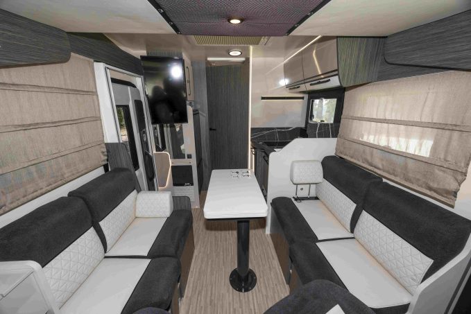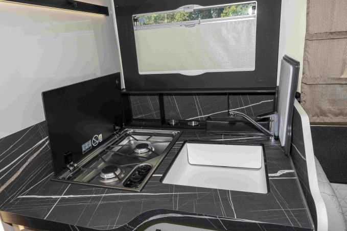 Côté cuisine, McLouis s’est inspiré du show-car Fluideen exposé par la marque sœur Mobilvetta, l’an dernier, aux salons de Düsseldorf et de Paris. On trouve donc un évier à bonde invisible, un porte-épices intégré, et un plan de travail façon marbre du plus bel effet. Le modèle embarque également un nouveau réfrigérateur à compression de 158 L.