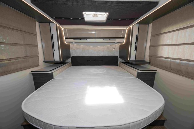 À l’intérieur, la transformation est tout aussi marquée. L’ambiance est plus lumineuse, les matériaux plus flatteurs, le mobilier plus raffiné. La chambre est équipée d’un lit central réglable en hauteur pour moduler le volume de la soute, de placards de pavillon, de deux penderies et de tablettes pivotantes discrètes.